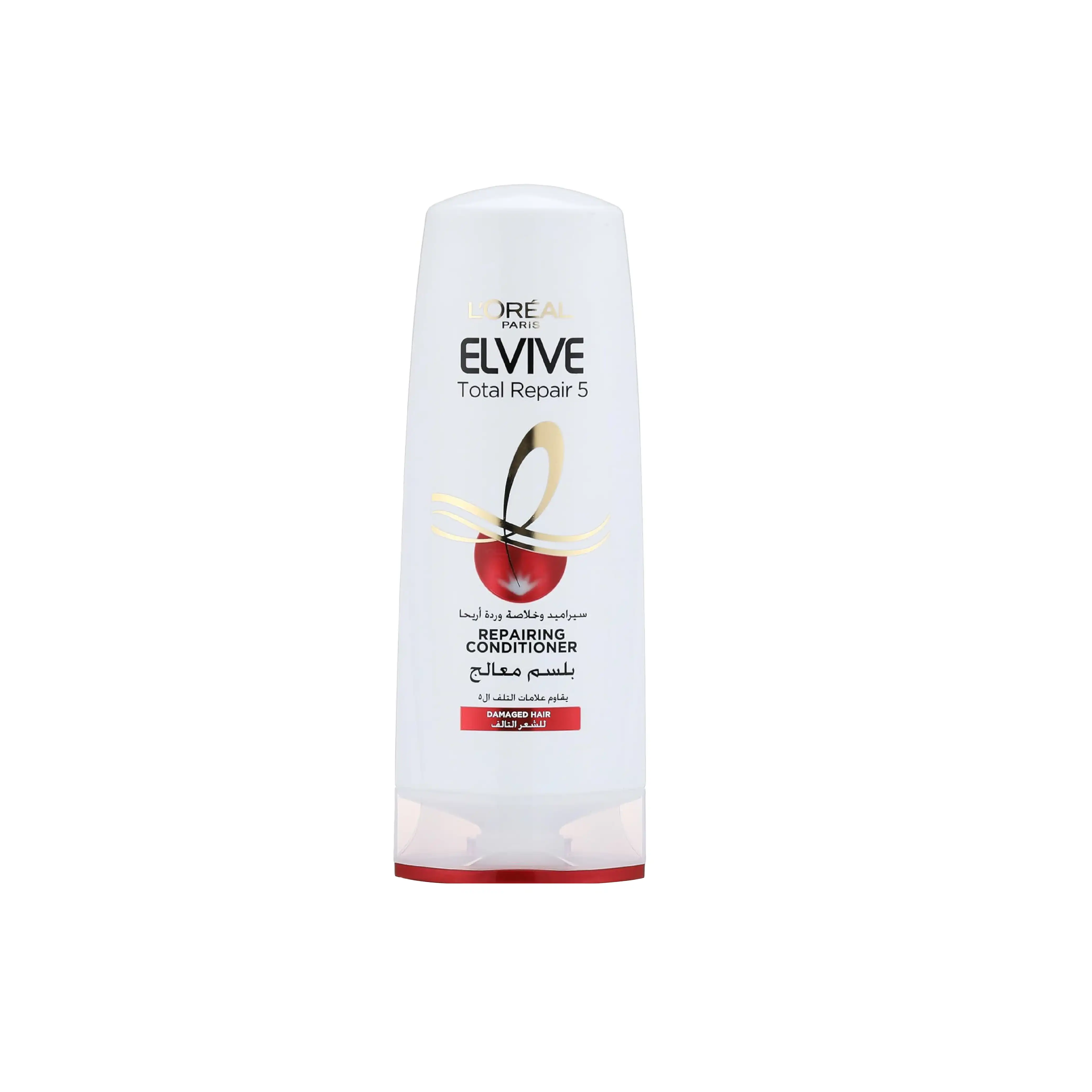 اسم المنتج: ELVIVE TOTAL REPAIR CONDITIONER 360 ml العلامة التجارية: Elvive (L’Oréal Paris) الوصف العام للمنتج: بلسم مُصمم خصيصًا لإصلاح الشعر التالف والضعيف. بتركيبته الغنية بمركب السيراميد، يُعيد بناء ألياف الشعر ويُعزز من قوته. فوائد المنتج: يُصلح التلف، يُقلل من التقصف، ويُضفي نعومة ولمعانًا. تعليمات الاستخدام: يُوضع على الشعر بعد الشامبو ويُترك لبضع دقائق ثم يُشطف. معلومات إضافية: يُستخدم مع شامبو توتال ريبير للحصول على أفضل النتائج.