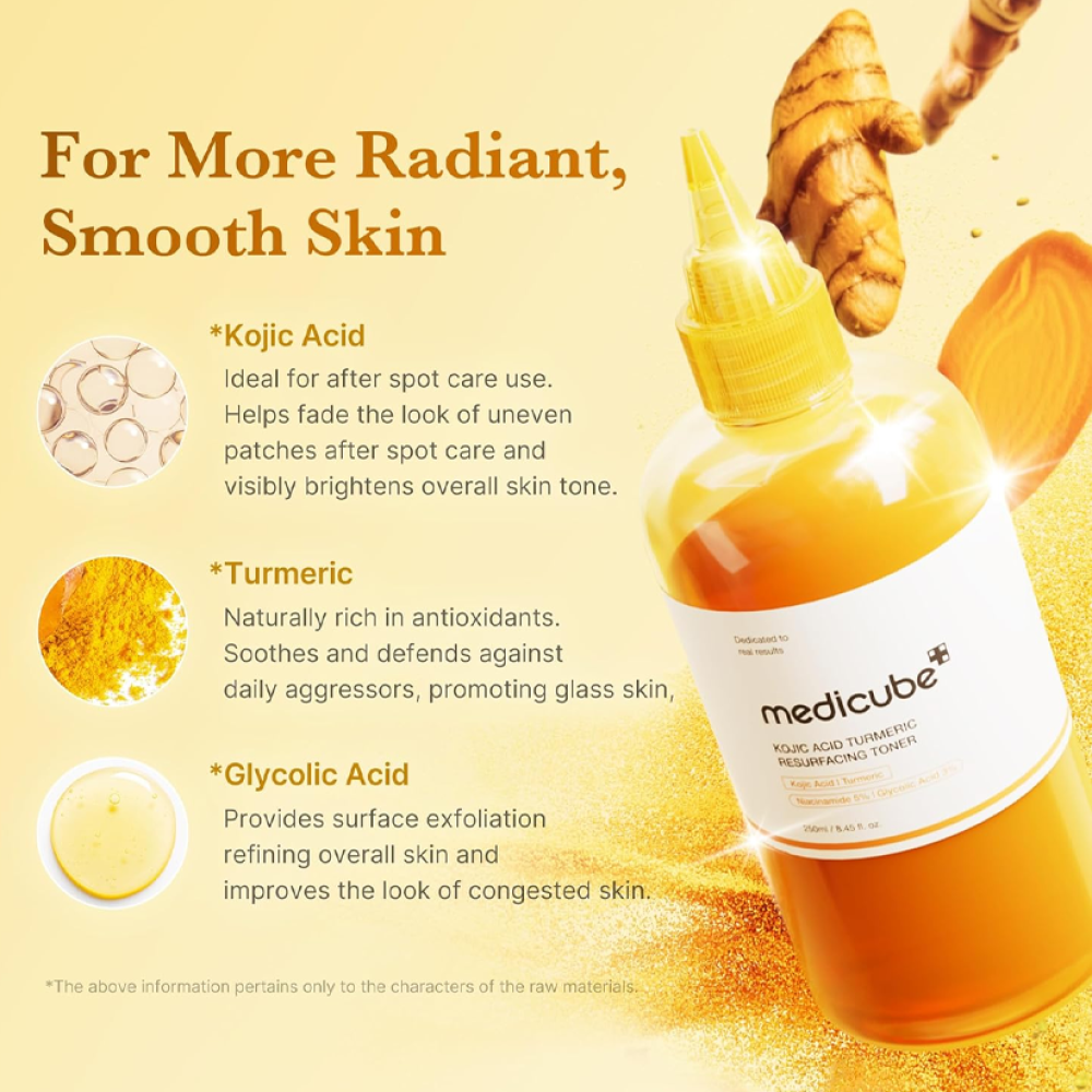 استعيدي إشراقة بشرتك مع Medicube Kojic Acid & Turmeric Resurfacing Toner. صُممت هذه التركيبة المبتكرة لتكون الخطوة الأساسية في روتين تفتيح البشرة، حيث تدمج بين المكونات العلمية المثبتة والمستخلصات النباتية القوية لمكافحة فرط التصبغ والبشرة غير المتساوية، مع الحفاظ على توازن الرطوبة الطبيعي للجلد.