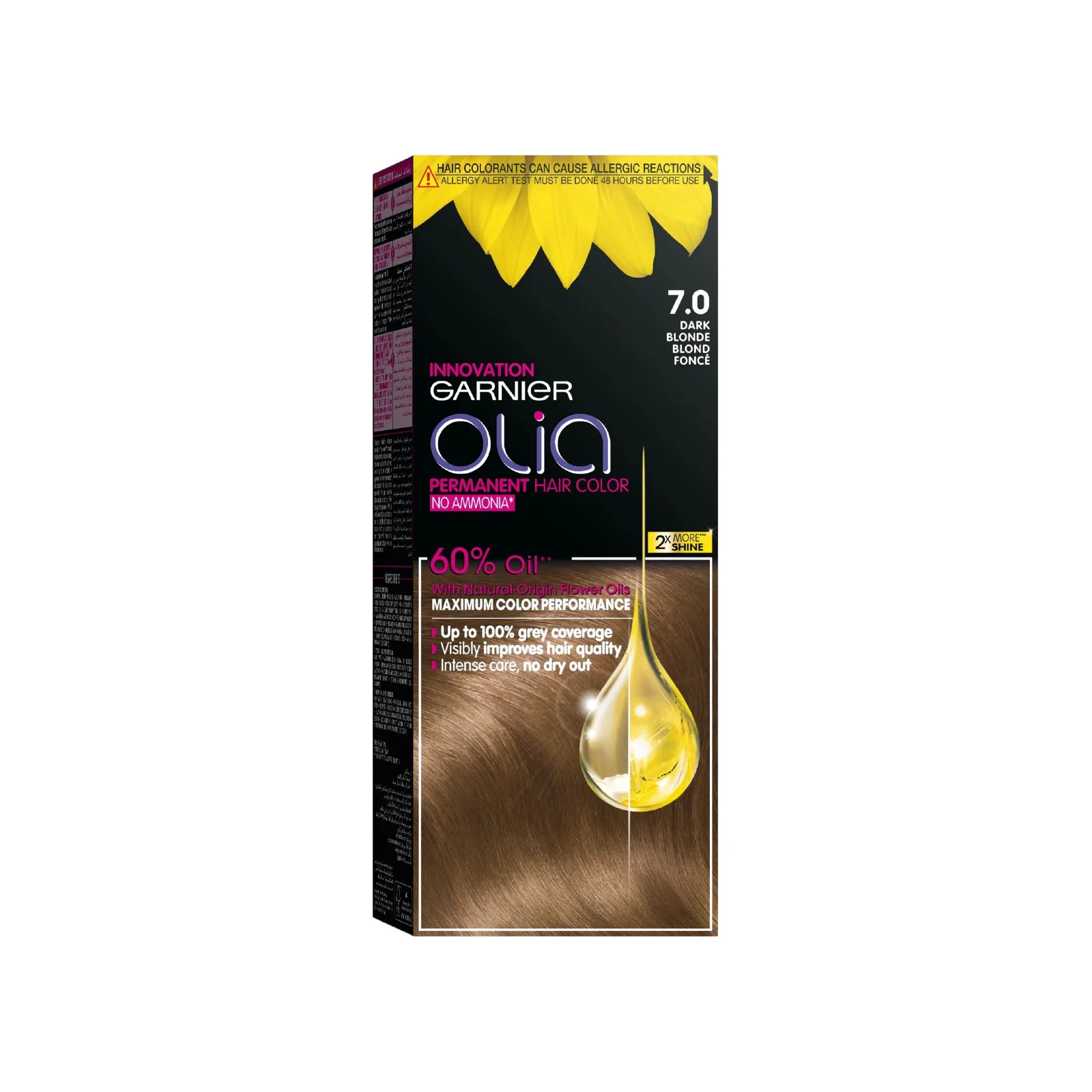 غارنييه أوليا 7.0، لون أشقر غامق. صبغة شعر دائمة خالية من الأمونيا، تمنحك لونًا طبيعيًا ولامعًا.