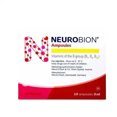اسم المنتج: NEUROBION العلامة التجارية: Neurobion الوصف العام: مكمل غذائي يحتوي على فيتامينات B1، B6، وB12. يُستخدم لعلاج نقص فيتامينات B، ودعم صحة الأعصاب، وتخفيف آلام الأعصاب الطرفية. فوائد المنتج: – يدعم صحة الأعصاب. – يساهم في تخفيف آلام الأعصاب. – يعزز وظائف الجهاز العصبي. تعليمات الاستخدام: يؤخذ حسب توجيهات الطبيب. معلومات إضافية: – الشكل الصيدلاني: أمبولات للحقن. – التركيب: فيتامينات B1، B6، وB12. – تحذيرات: يُعطى تحت إشراف طبي. يُحفظ بعيدًا عن متناول الأطفال. – الكمية: 10 أمبولات.